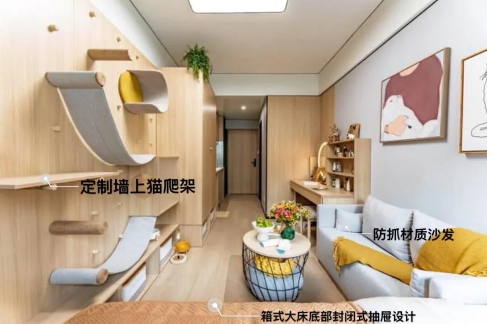 宠物主题房从设计和配置来看,主要面向的是养猫的租户。房内墙壁上装有可供猫咪活动玩耍的爬架和猫抓板,沙发也使用定制防抓帆布材质,值得一提的是该房间还采用了底部为封闭式抽屉设计的箱式大床,入住的用户不用再另外自行购买床底挡板,有效杜绝了宠物因随意钻入藏污纳垢的卫生死角而引发卫生和健康问题,细节贴心,用户省心。