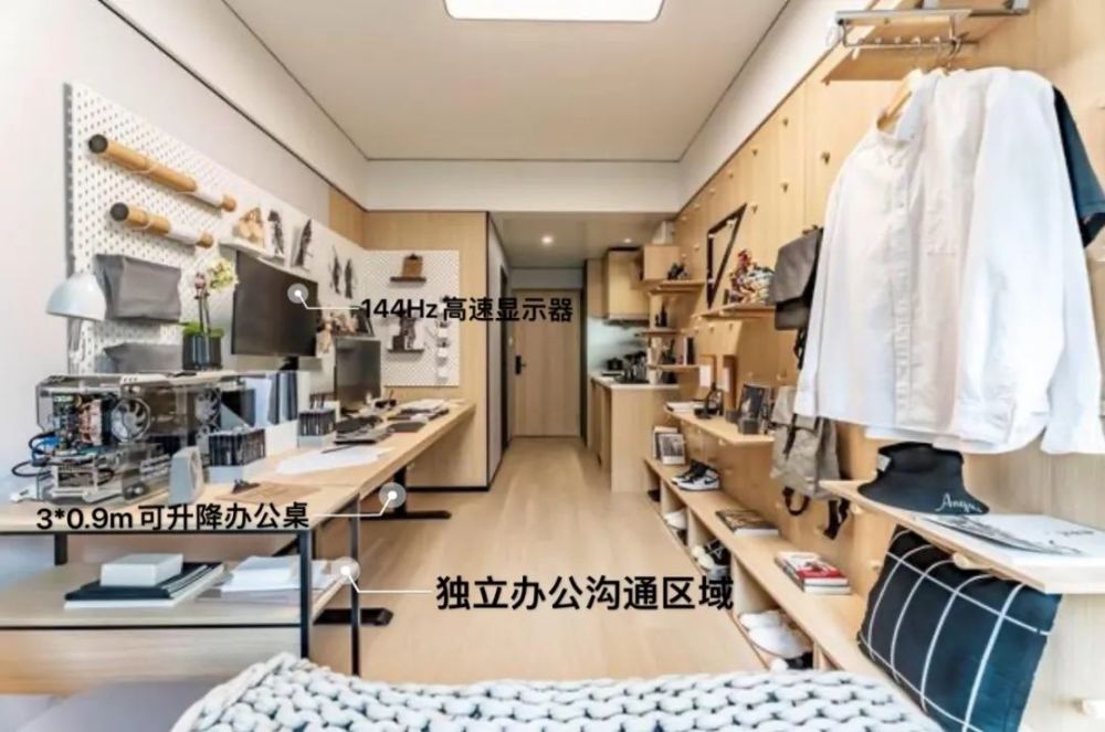 伴随着当下“斜杠青年(拥有多重职业和身份的多元生活的人群)”、“SOHO青年(专门的居家办公自由职业者,如自由撰稿人、艺术家、平面设计师等)”数量的增加,专属的独立办公区域空间和自由的沟通环境成为该群体的租住刚需。泊寓的SOHO房基于此需求,配备了3*0.9m的可升降办公桌、144Hz的高速显示器,让入住的用户可以在此尽情发挥才华、创造价值。