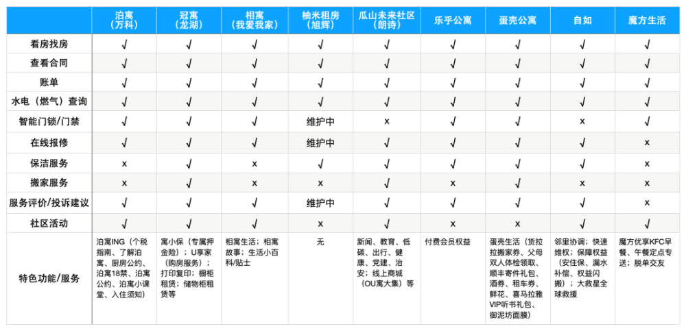 明源君选择了9家公寓运营商的APP进行对比,显示其基础功能大同小异,大多包含看房、选房、签约、缴费、报修、换租退租等,但也有部分APP却有着自己专属的特色功能。
