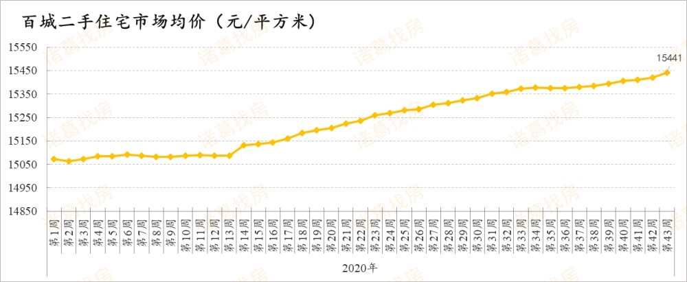 据报告,2020年第43周,百城二手住宅市场均价为15441元/平方米,环比上涨0.14%,涨幅较第42周扩大0.08个百分点。报告分析称,4月初以来,随着疫情的影响逐步消退,市场活力持续提升,土地、新房市场一度火热,一定程度上带动二手房市场预期转好,自2020年13周以来,二手住宅价格保持上行趋势,进入8、9月后,随着越来越多的城市加入调控大军,市场价格涨幅逐渐趋稳,二手住宅市场保持稳中有升的态势。