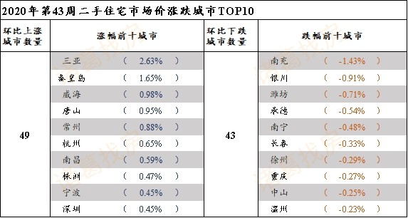 第43周,环比涨幅TOP10以珠三角、长三角、环渤海的二线和三四线城市为主。其中,珠三角经济圈的三亚价格涨幅为2.63%,连续两周位居价格涨幅首位;秦皇岛价格涨幅为1.65%,位居涨幅第二,威海价格涨幅为0.98%,位居第三。