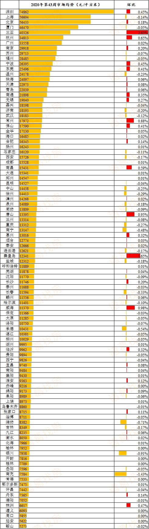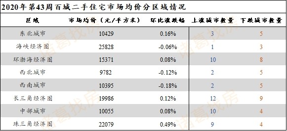 分区域来看,2020年第43周,有5个区域市场均价上涨,3个区域市场均价下跌。上涨城市中,珠三角城市市场均价为22079元/平方米,环比上涨0.49%,涨幅居首,东北城市市场均价为10429元/平方米,环比上涨0.16%,位居涨幅第二。下跌城市中,西南城市市场均价为10395元/平方米,环比下跌0.18%,跌幅居首;其次为西北城市,市场均价为9782元/平方米,环比下跌0.12%。
